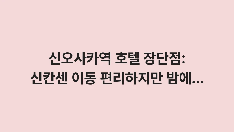 신오사카역 호텔 장단점을 완벽하게 분석하여 효율적인 일본 여행 계획을 도와드립니다. 신칸센 이용의 편리함과 뛰어난 교통 접근성이라는 강력한 장점부터 밤 시간대 주변 환경의 단점까지 실질적인 투숙 경험을 바탕으로 상세히 정리했으니 숙소 선택 전 반드시 확인하세요. , 이어서