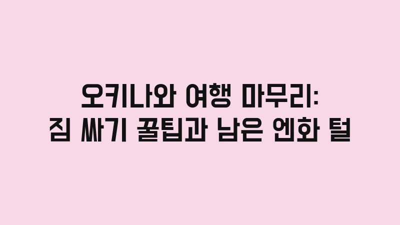 오키나와 여행 마무리는 짐 싸기와 남은 엔화 처리가 핵심입니다. 액체류는 반드시 위탁 수하물로 부치고, 남은 엔화 동전은 공항 내 편의 시설을 통해 모두 소진하세요. 이 짐 싸기 꿀팁을 통해 당신의 오키나와 여행이 시작부터 끝까지 완벽하게 마무리되기를 바랍니다.