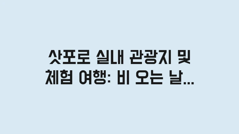 당신의 소중한 여행 일정이 날씨 때문에 망가지는 것을 원하지 않는다면, 이 글이 완벽한 해결책이 될 것입니다. 10년 차 여행 전문가인 제가 삿포로 실내 관광지 중에서 가장 재미있고, 유익하며, 독특한 경험을 제공하는 베스트 5 코스를 엄선했습니다. 이 로드맵을 따라 비 오는 날에도 후회 없는 삿포로 여행을 즐기세요.