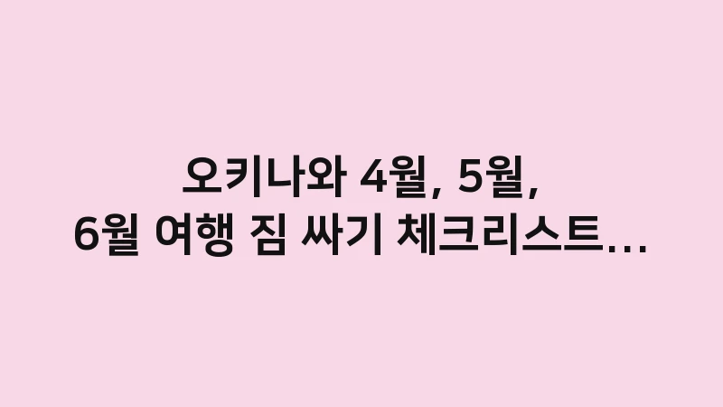 오키나와 4월, 5월, 6월 여행 짐 싸기 체크리스트를 통기성 의류, 우산 등 계절별 필수 아이템 중심으로 제공합니다. 초여름과 장마철이라는 극과 극의 날씨에 모두 대응할 수 있는 ‘최소 짐 싸기’ 전략과 놓치기 쉬운 꿀팁을 포함합니다. 이 체크리스트로 완벽한 여행 준비를 끝내세요. , 이어서